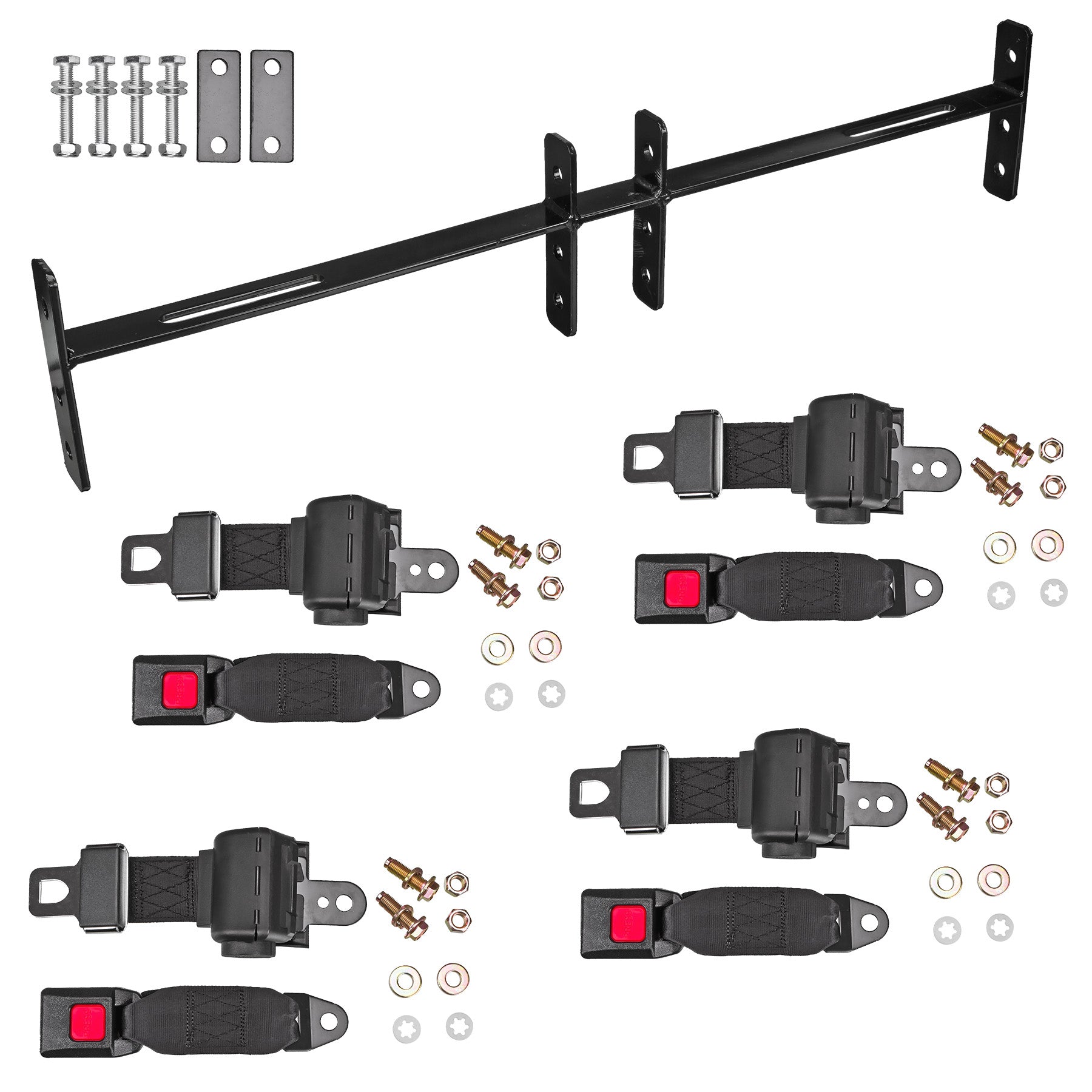 Entire seat belt kit for golf carts equipped with rear seat kits.